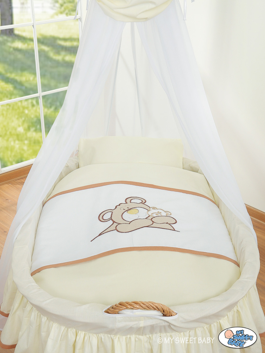 A beautiful basket. The biggest bassinet on the market. A white color of wicker and wood.