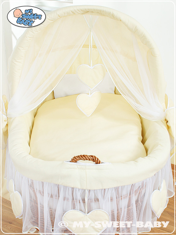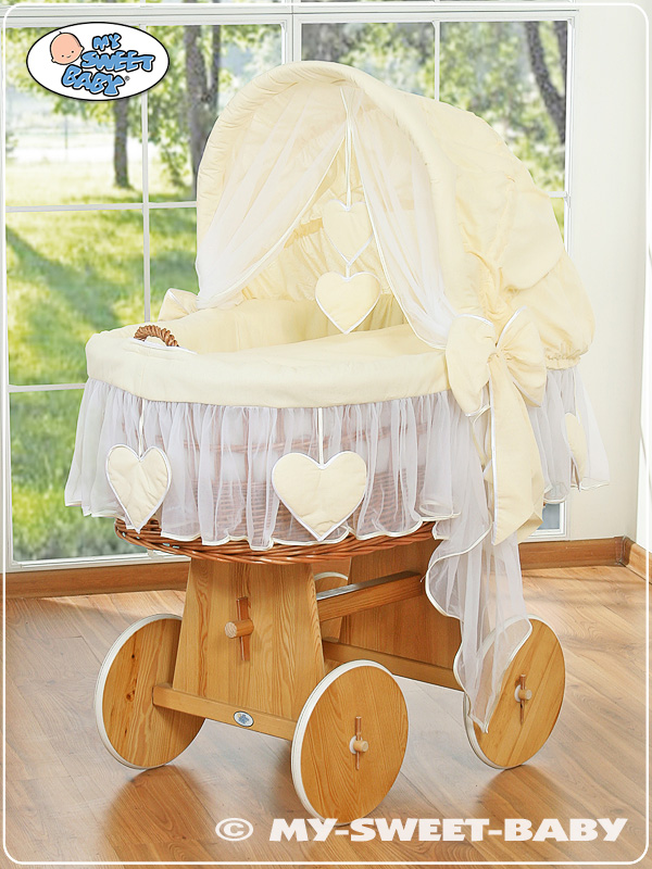 A beautiful basket. The biggest bassinet on the market. A natural color of wicker and wood. The set includes complete bedding and hood cover as shown in the picture. · The biggest bassinet on the market with total sizing of L 98 cm, B 65 cm, H 130 cm. The biggest lying space: 80×45 cm allows to use the crib longer. Suitable from birth to 9 months approx. · Manually caned basket made of healthy, natural wicker. · The chassis made of real wood, very stable! Much higher than in other producers – 50 cm high. It brings comfort as bending down for the baby is not necessary. · Big wheels made of real wood (with the diameter of 30 cm) turn lightly and quietly. Each wheel has white rubber tyres that leave no marks on the floor. · All materials, from the wood for the chassis, through the wicker for the basket, to materials and the trim stuffing are precisely inspected and finished in detail. · The handle at the front of the bassinet allows to change its position easily. · Special hood mechanism allows to place the hood in every position. The mechanism is fixed to the basket, nevertheless, its elements may be easily disassembled to be take off the trim for washing. · Each basket is lined with a thick layer of fleece trimmed with cotton. It makes the basket a soft and comfortable nest your baby may sleep in. · A cotton pillow (35x37cm) and cover (78x78cm) are filled with special anti-allergic stuffing, very light and warm. The bed – clothing is 100% cotton. All elements may be mechanically washed. · The whole is easy – to –assemble, it’s enough to follow the assembly instruction. Just two moves and it’s ready! · Anti-allergic mattress, with a cover that may be taken off.