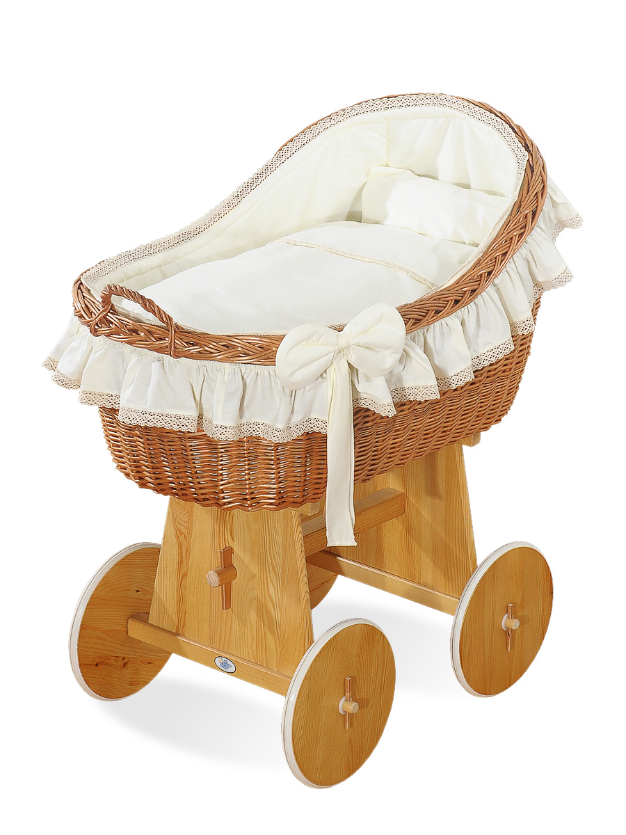 A unique wicker Moses basket on a solid wooden chassis.