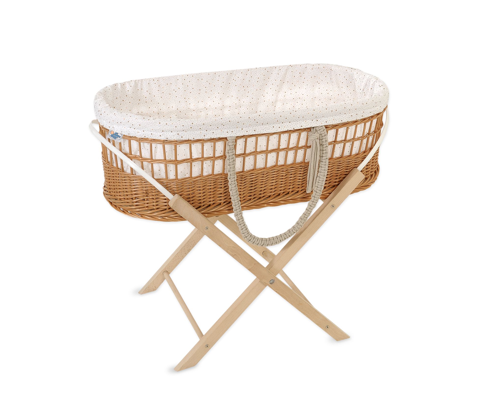 Included: wicker moses basket with linning, PREMIUM mattress, wooden frame for the basket.