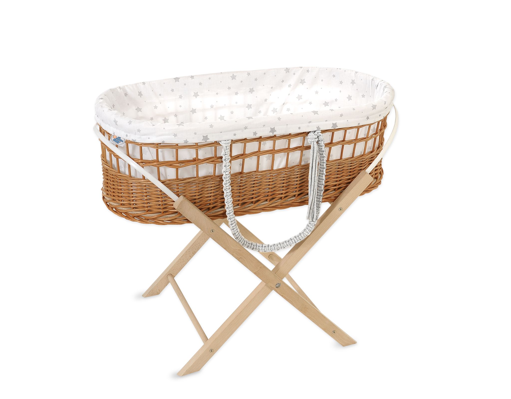 Moses wicker basket in BOHO style with stand with cotton lining – mini Stars grey