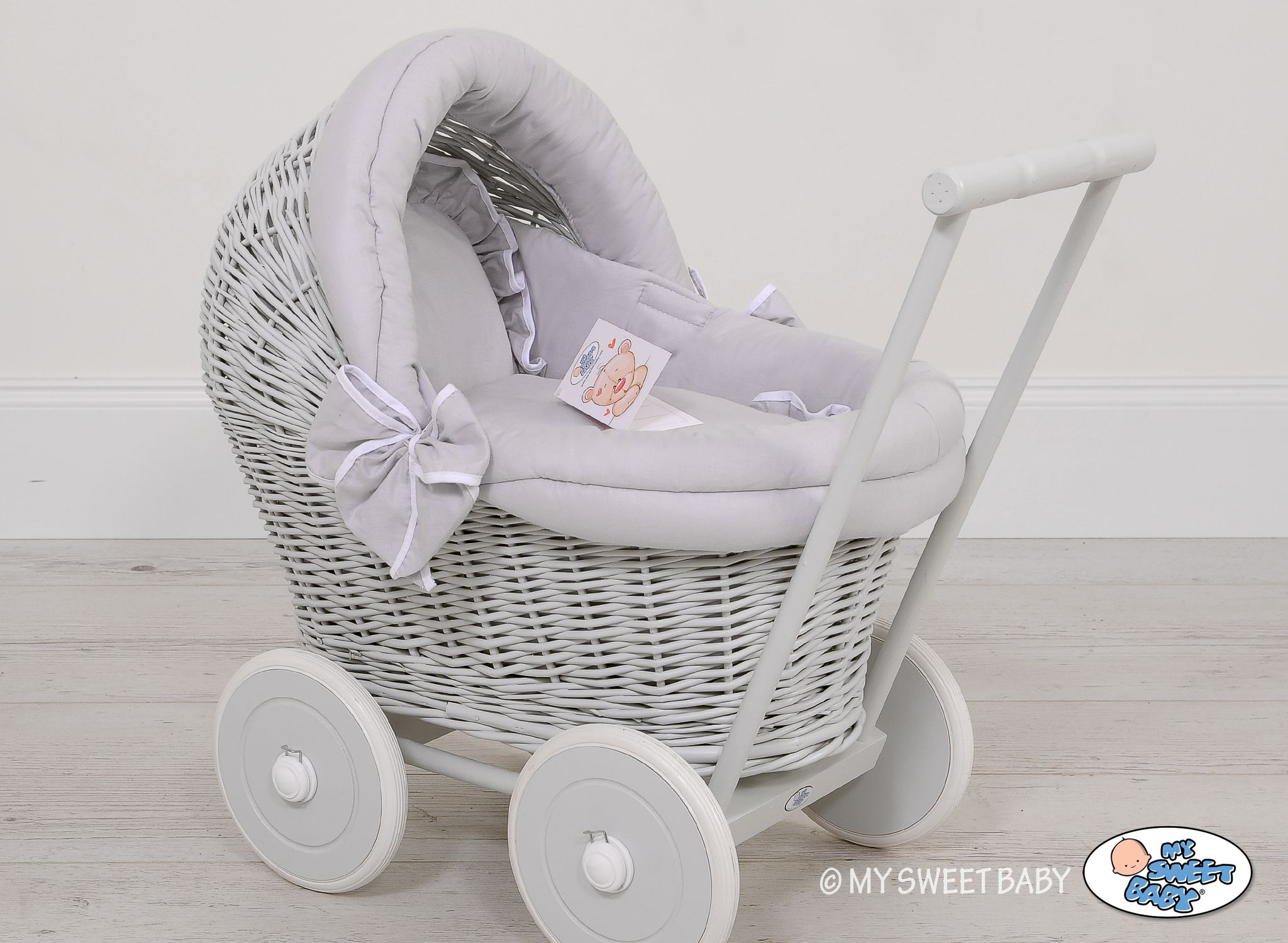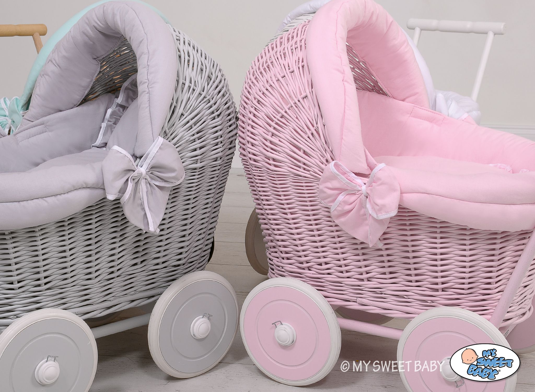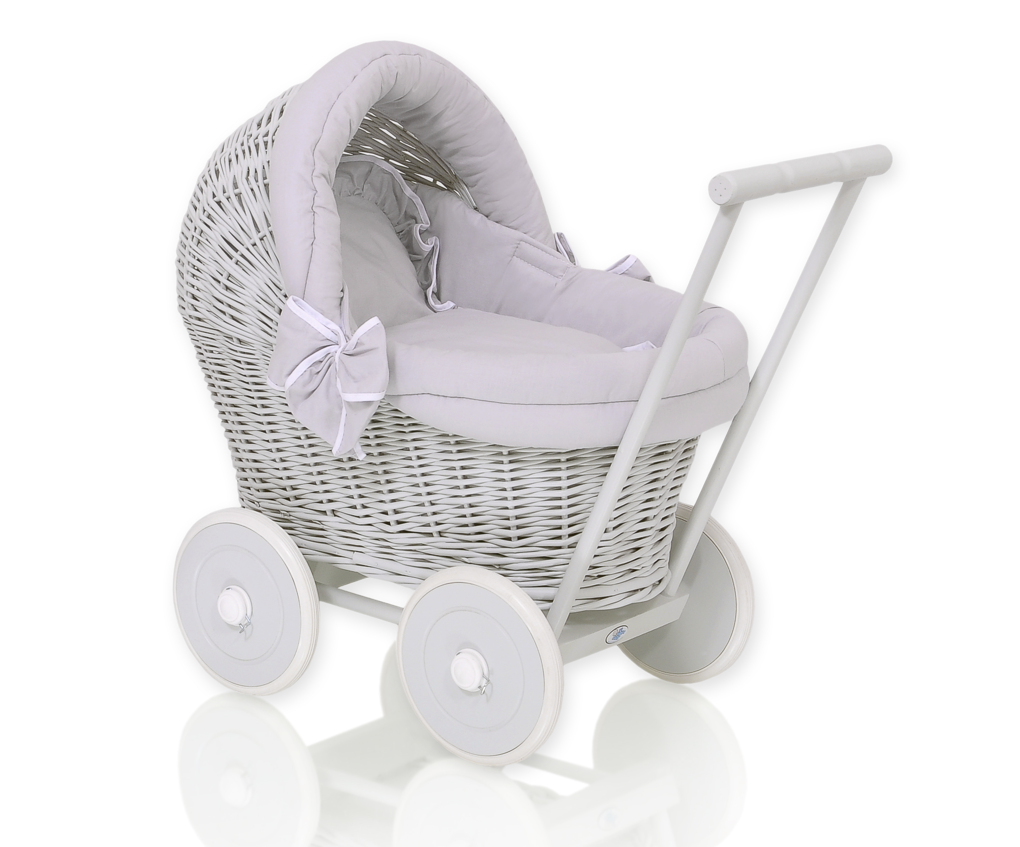 A great gift for a little girl – a beautiful wicker doll pushchair, stylish and unique. Handmade pram, top quality handicraft. Natural Polish wicker from ecological cultivation. The pram has a beautiful rounded shape. Wooden solid chassis made of natural beech wood, top quality. Sturdy stable handle makes it easy to steer the pushchair comfortably. Wooden wheels protected by a rubber tyre. The wheels are mounted on metal axles. A special “click-clack” safety device securely fastens the wheels and makes the wheels turn easily.