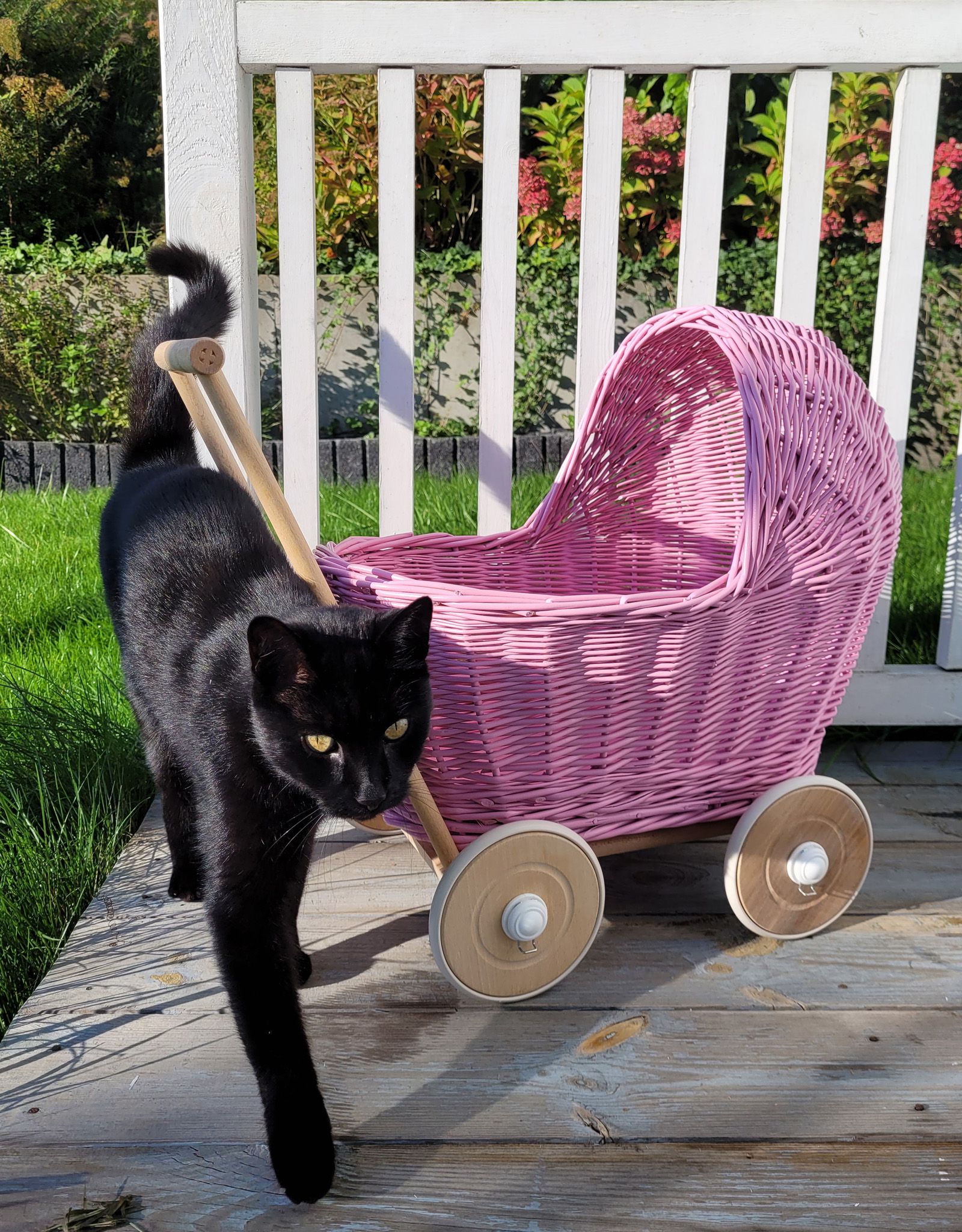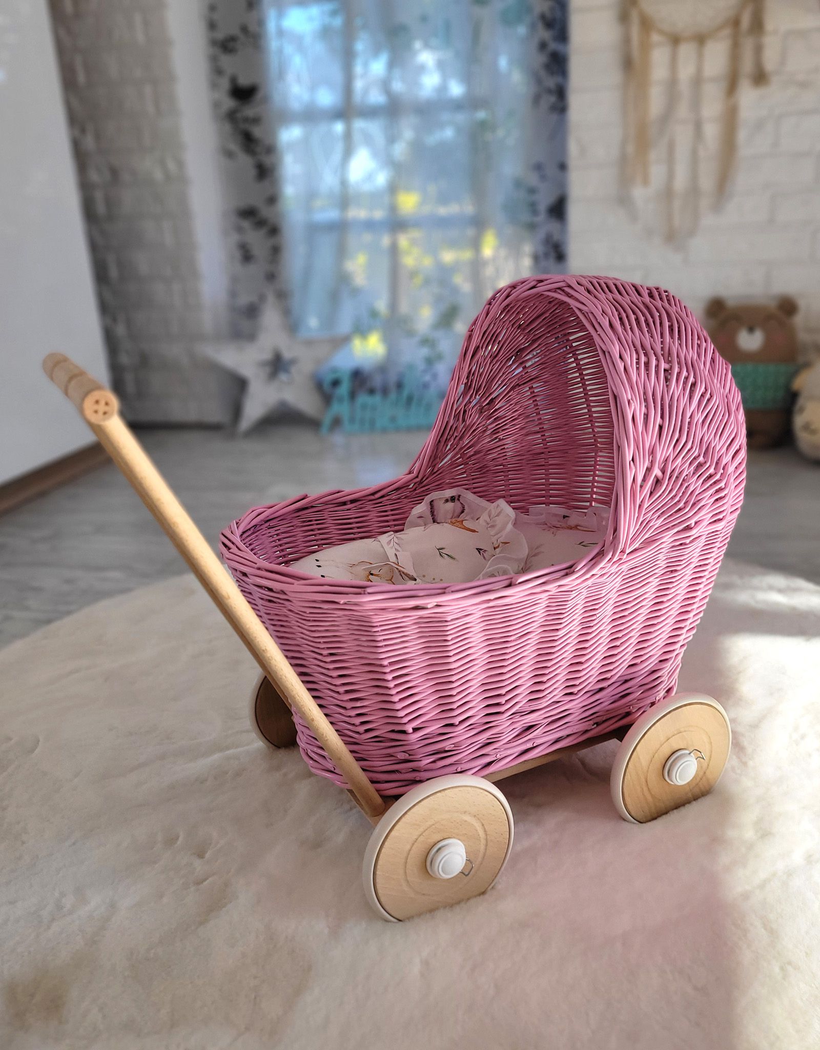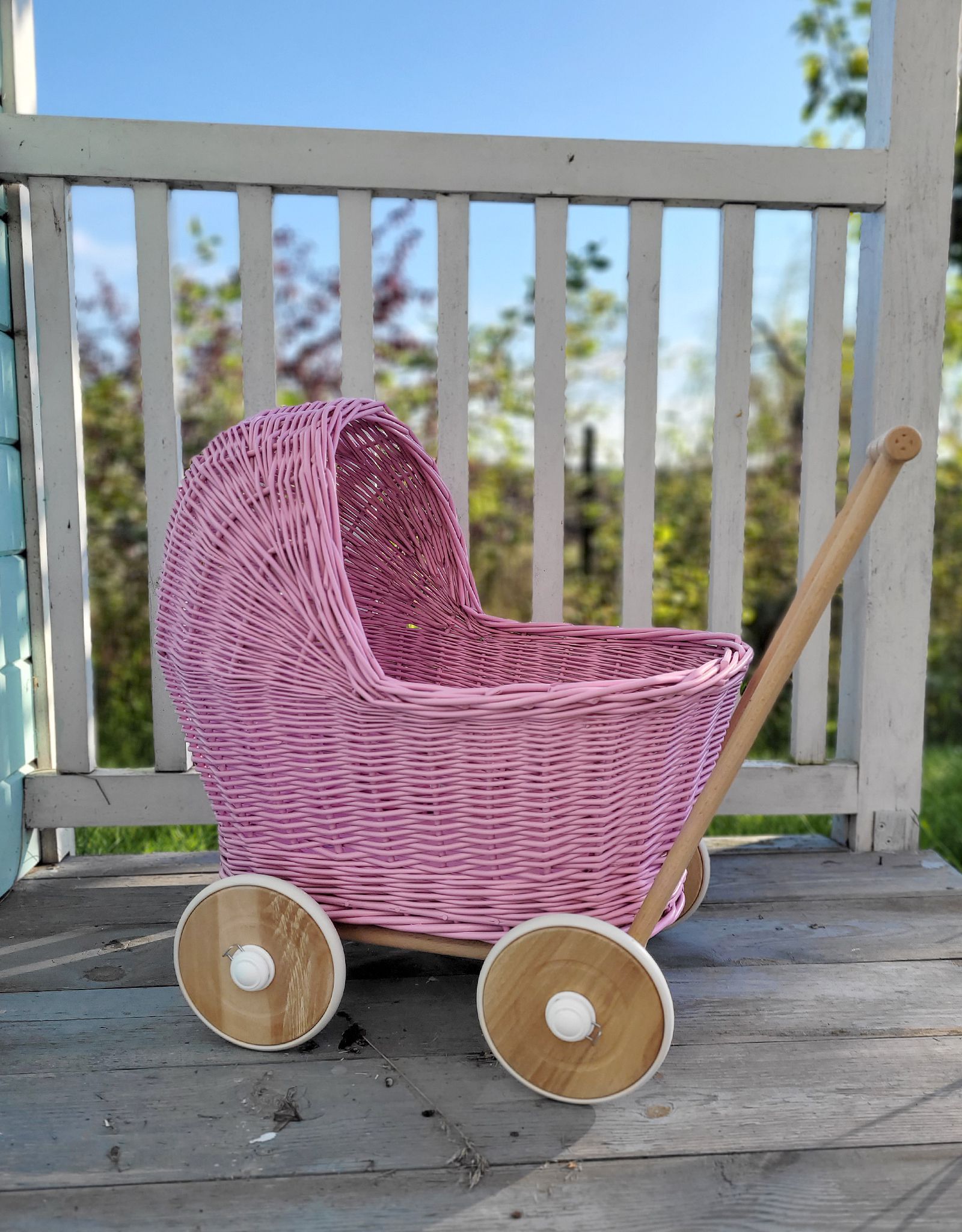 A great gift for a little girl – a beautiful wicker doll pushchair, stylish and unique. Handmade pram, top quality handicraft. Natural Polish wicker from ecological cultivation. The pram has a beautiful rounded shape. Wooden solid chassis made of natural beech wood, top quality. Solid stable handle makes it easy to steer the pushchair comfortably. Wooden wheels protected by a rubber tyre. The wheels are mounted on metal axles. A special “click-clack” safety device securely fastens the wheels and makes the wheels turn easily.