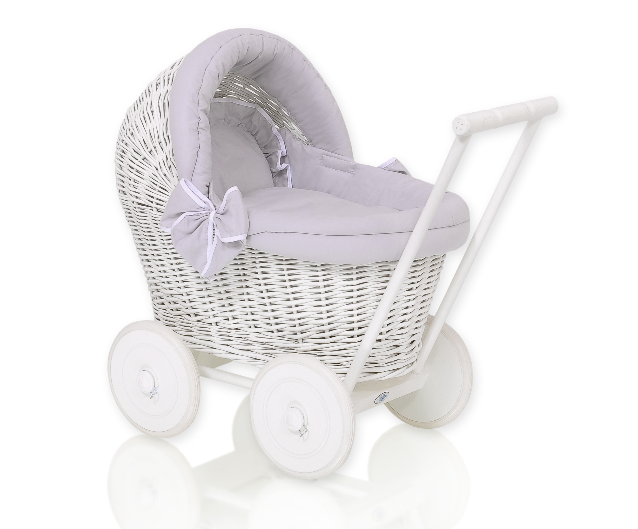 Wicker doll pushchair – made of natural wicker, on a natural wooden chassis with wooden wheels – white painted.