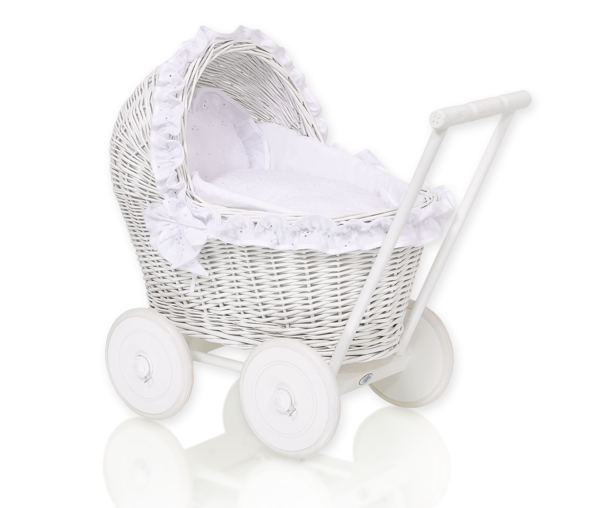 A great gift for a little girl – a beautiful wicker doll pushchair, stylish and unique. Handmade pram, top quality handicraft. Natural Polish wicker from ecological cultivation. The pram has a beautiful rounded shape. Wooden solid chassis made of natural beech wood, top quality. Sturdy stable handle makes it easy to steer the pushchair comfortably. Wooden wheels protected by a rubber tyre. The wheels are mounted on metal axles. A special “click-clack” safety device securely fastens the wheels and makes the wheels turn easily.