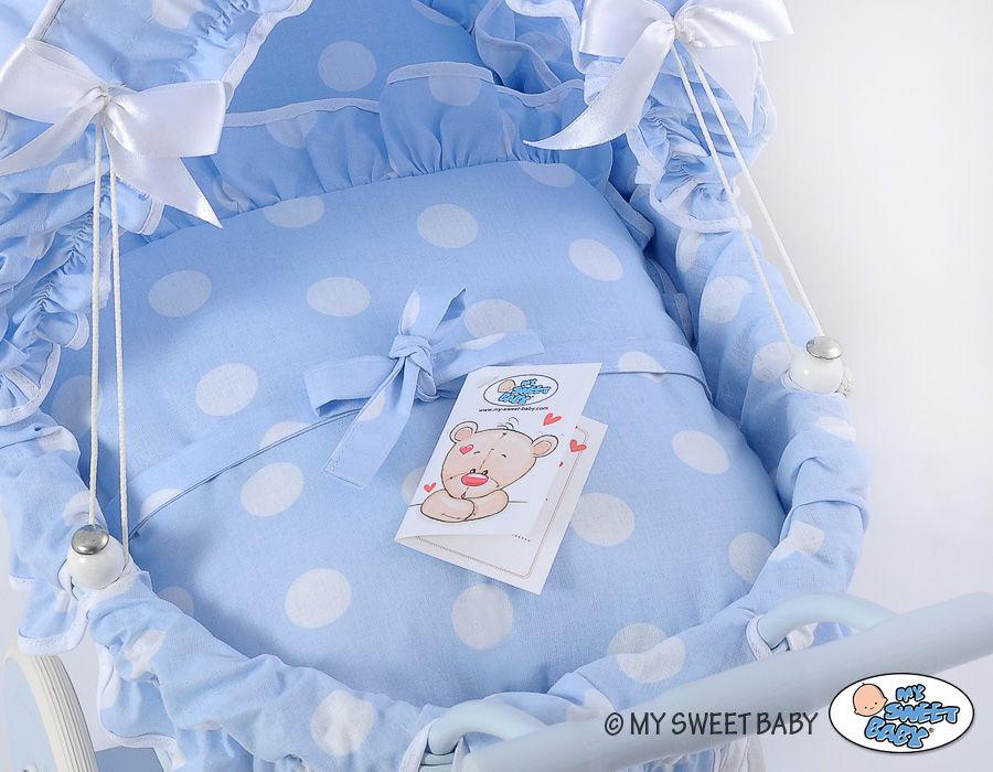 Wicker dolls’ pram with blau bedding and padding – white