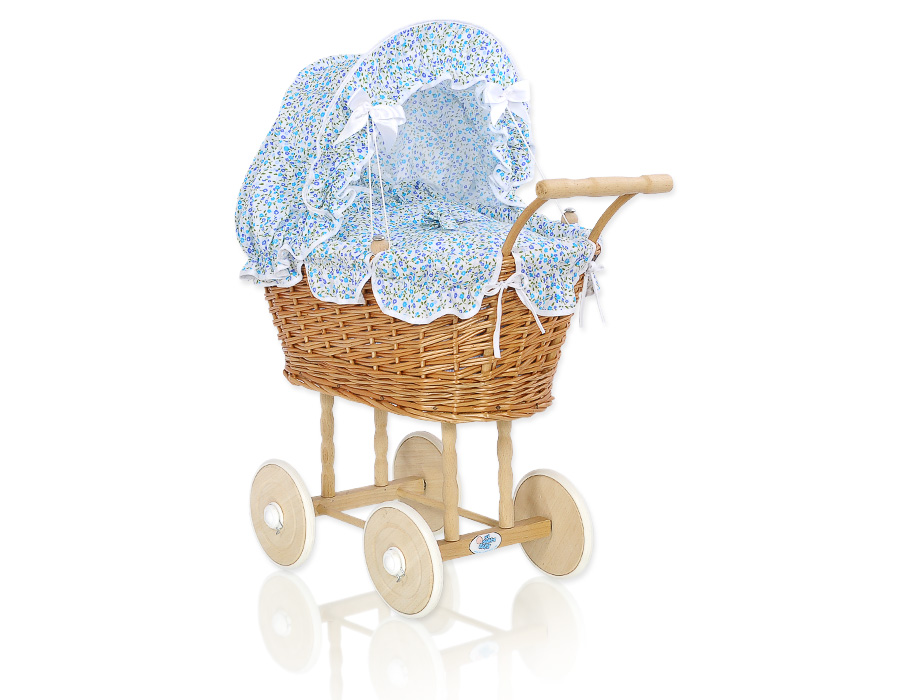 A great gift for a little girl – a beautiful wicker doll trolley MY SWEET BABY, stylish and unique. Handmade pram, top quality handicraft. Natural Polish wicker from ecological cultivation. The pram has a beautiful rounded shape. Wooden solid chassis made of natural beech wood, top quality. Solid stable handle makes it easy to steer the pushchair comfortably. High chassis comfortable for an older child. Wooden wheels protected by rubber tyre. The wheels are mounted on metal axles. A special “click-clack” safety device securely fastens the wheels and makes the wheels turn easily.