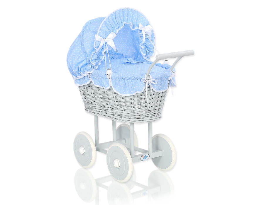 Wicker doll pram – made of natural wicker, on a natural high wooden chassis with wooden wheels – grey painted.
