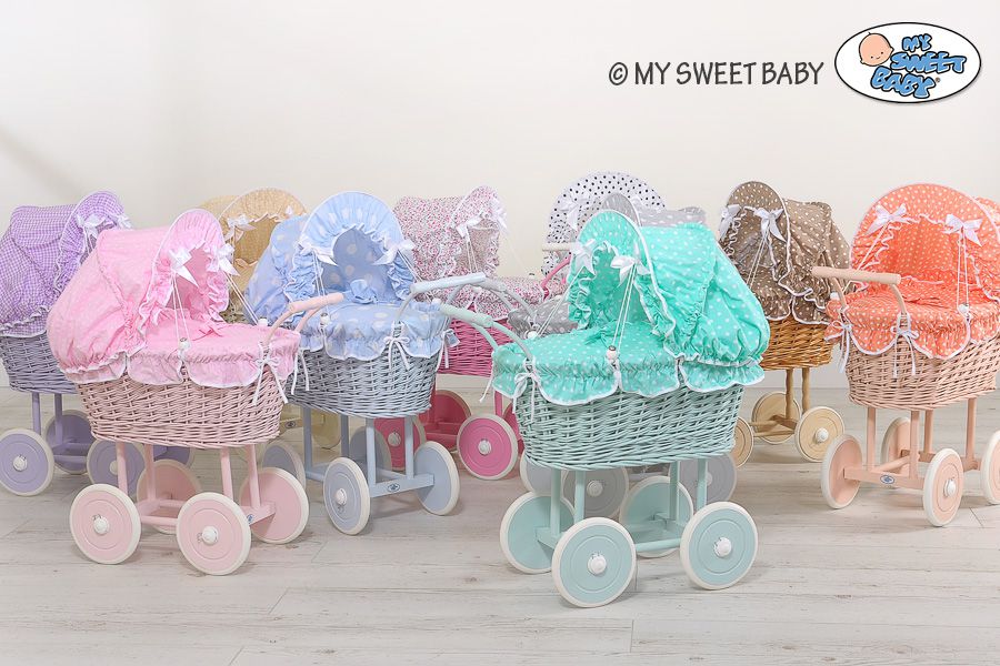 A great gift for a little girl – a beautiful wicker doll trolley MY SWEET BABY, stylish and unique. Handmade pram, top quality handicraft. Natural Polish wicker from ecological cultivation. The pram has a beautiful rounded shape. Wooden solid chassis made of natural beech wood, top quality. Solid stable handle makes it easy to steer the pushchair comfortably. High chassis comfortable for an older child. Wooden wheels protected by rubber tyre. The wheels are mounted on metal axles. A special “click-clack” safety device securely fastens the wheels and makes the wheels turn easily.