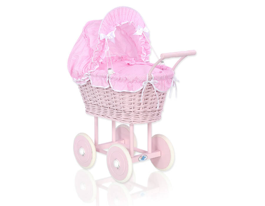 Wicker doll pram – made of natural wicker, on a natural high wooden chassis with wooden wheels – pink painted.