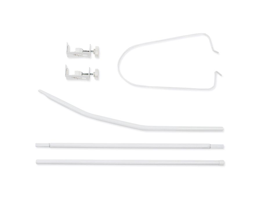 The two brackets with the fastening screws can be moved freely on the tube. It is also possible to adjust the thickness of the elements to which the frame is attached. The upper tube is connected to the wire on which the canopy or mosquito net is attached.