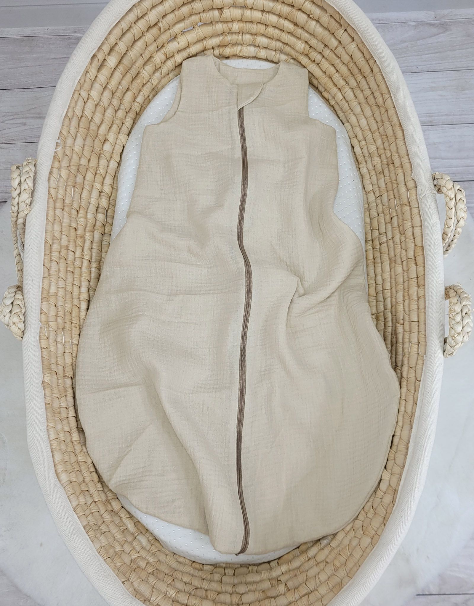 Lightweight muslin baby sleeping bag is made of durable 100% certified cotton crepe muslin. Muslin is nice and pleasant to touch. It does not irritate the delicate baby skin. At the same time it is extremely easy to use.