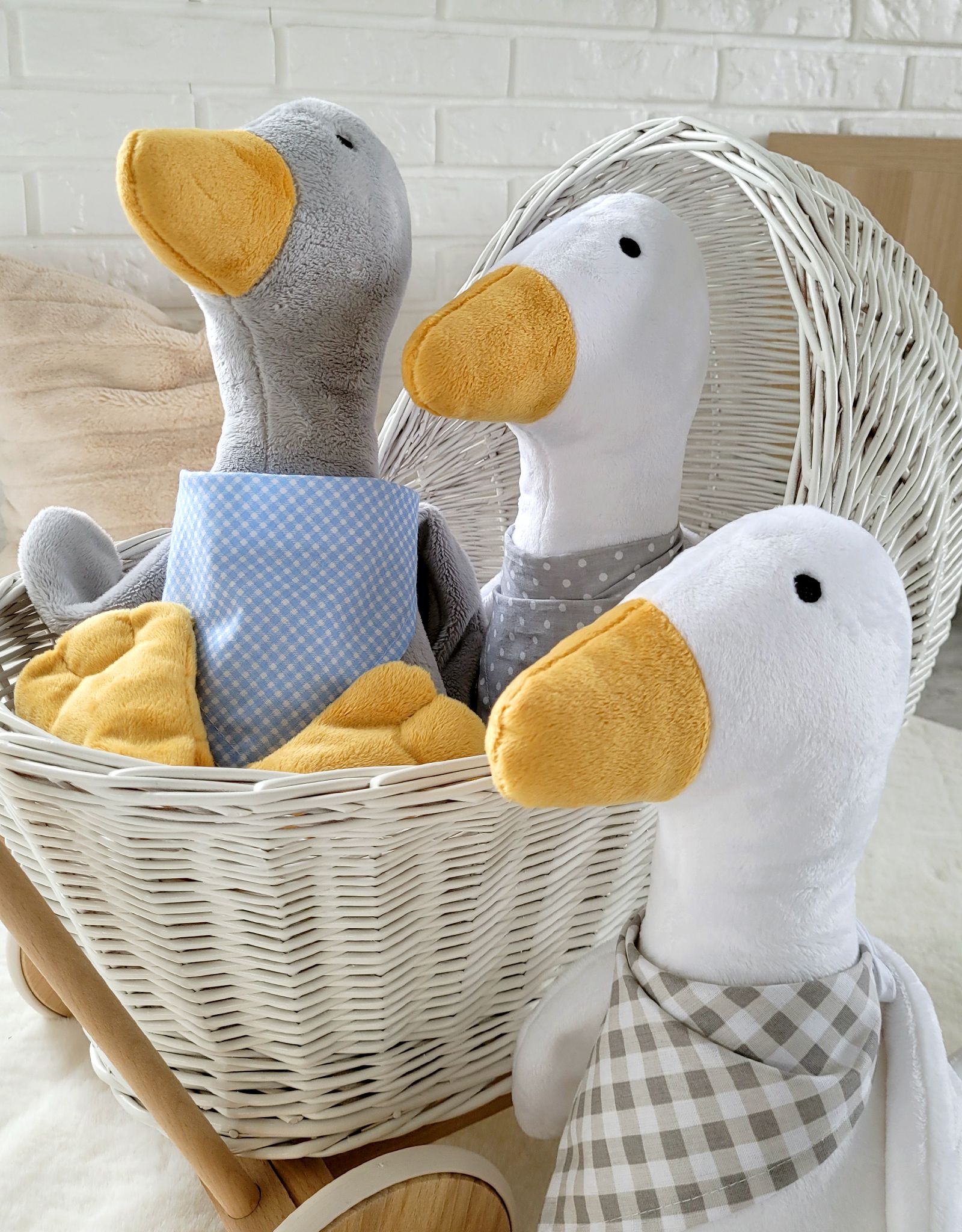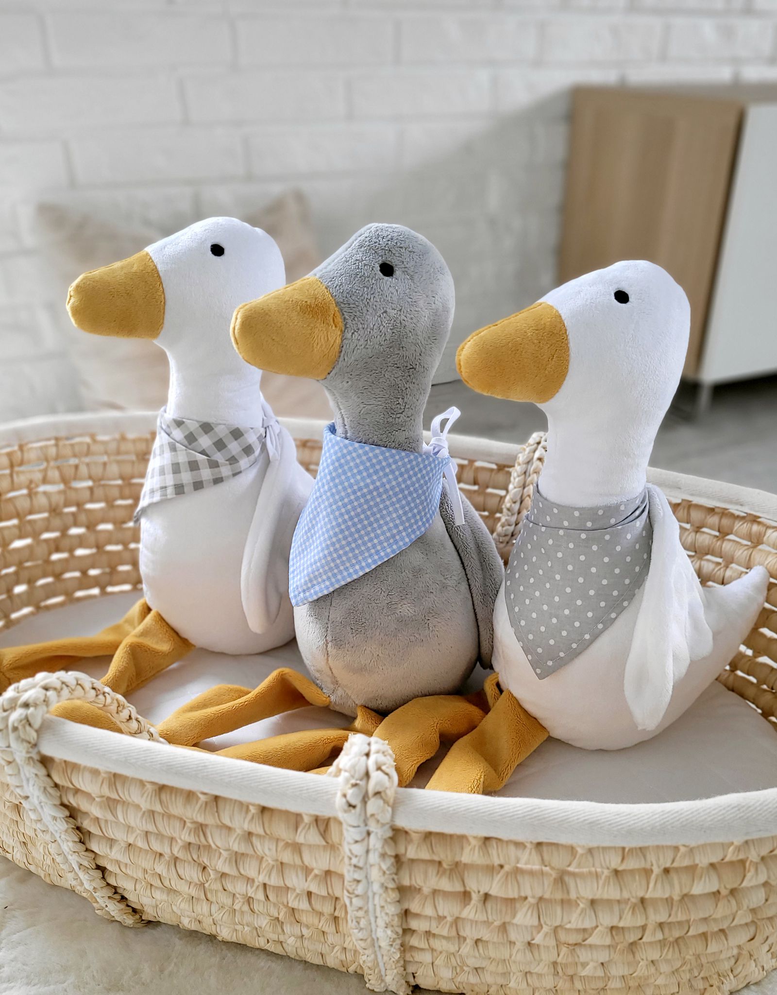 Decorative white plush goose made of soft touch, fluffy and delicate minky fleece. The filling inside the goose it is Eco Fillball- atested Silicone Balls – “artificial fluff” for pillows- filling ensures proper settlement of the baby and air circulation.