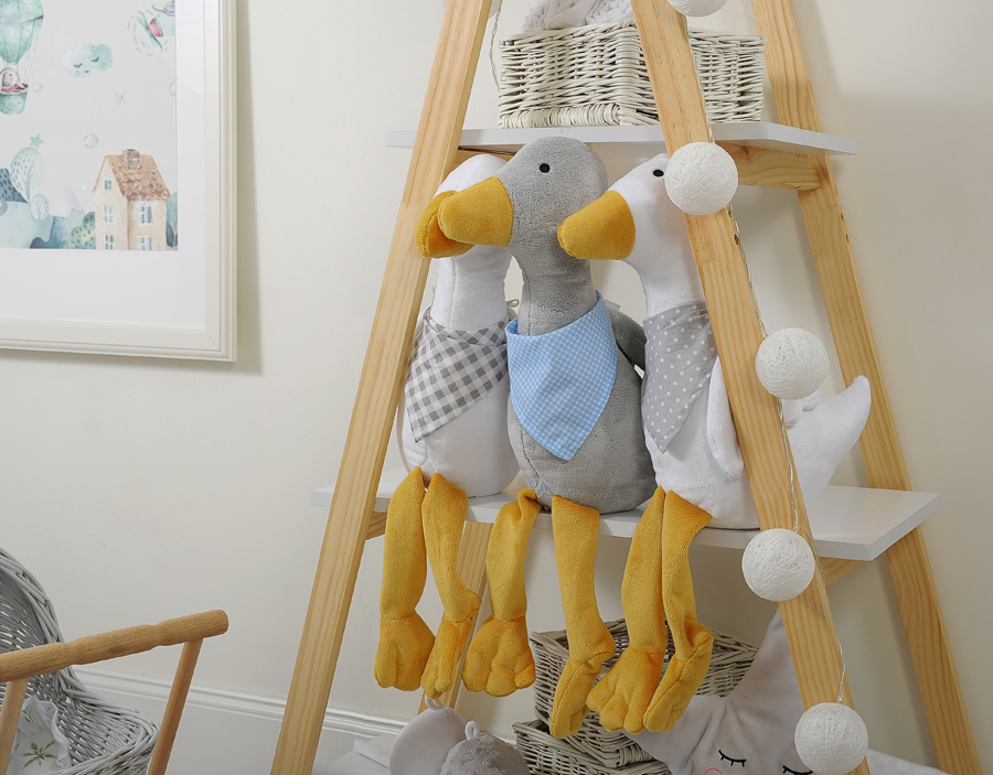 The goose can also be used as a cuddly toy. Around the goose’s neck is a decorative scarf in grey. The pattern on the scarf may differ.
